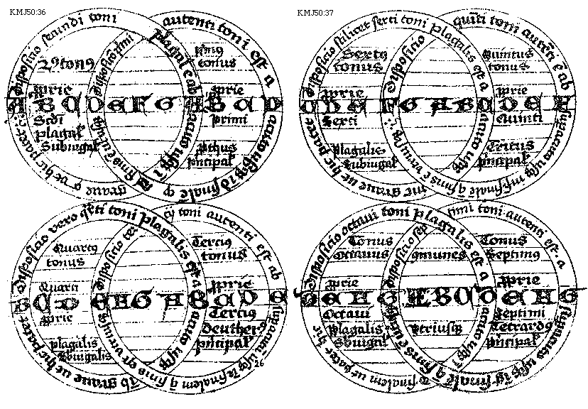[37][KMJ50:37; text: Disposicio scilicet sexti toni plagalis est a C acuto usque in c graue ut hic patet, Disposicio quinti toni autenti est ab F superacuto usque in f finalem quae finis est utriusque, Sextus tonus, proprie sexti, plagalis subiugalis, Quintus tonus, proprie Quinti, Tritus principalis, C, D, E, F, G, A, B, Disposicio octaui toni plagalis est a D acuto usque in d finalem ut patet hic, Disposicio septimi toni autenti est a G superacuto usque in g finalem quae finis est utriusque, Tonus octauus, proprie Octaui, plagalis subiugalis, communes utriusque, Tonus Septimus, proprie Septimi, Tetrardus principalis]