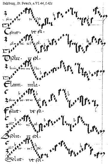 [f.42r][Salzburg, St. Peter's, a.VI.44, f.42r; text: fa in vt, vt in fa, Cfaut. vtfa. sol in re. re in sol. Dsolre. resol. la in mi. mi in la. Elami. mila. Ffaut. Gsolre. sol in vt. vt in sol. Solut. vtsol.]