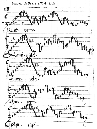 [f.42v][Salzburg, St. Peter's, a.VI.44, f.42v; text: re in vt. vt in re, Reut. vtre. la in mi. mi in la. Alami. mila. la in re. re in la. Lare. rela. mi in re. re in mi. Mire. remi. sol in fa, fa in sol, Csolfa. fasol.]