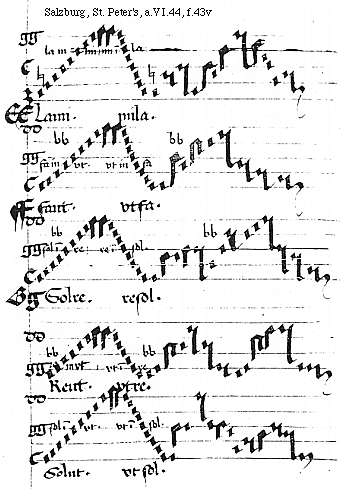 [f.43v][Salzburg, St. Peter's, a.VI.44, f.43v; text: la in mi. mi in la. EELami. mila. fa in vt. vt in fa, FFfaut. vtfa. sol in re. re in sol. GGSolre. resol. re in vt. vt in re, Reut. vtre. sol in vt. vt in sol. Solut. vtsol.]