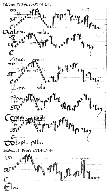 [f.44r][Salzburg, St. Peter's, a.VI.44, f.44r; text: la in mi. mi in la. AAlami. mila. mi in re. re in mi. Mire. remi. la in re. re in la. Lare. rela. sol in fa. fa in sol, CCsolfa. fasol. la in sol. sol in la. DDLasol. solla.]