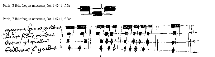 [Paris, Bibliotheque nationale, lat. 14741, f.3v; text: Maxima primus gradus, Longa secundus gradus, breuis tercius gradus, Semibreuis quartus gradus]