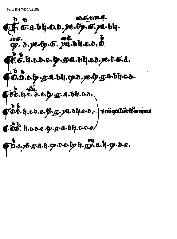 [Paris BN 7400A:f.25r; text: A.C.D.F.G.a.b[sqb].c.d.e.g. ya.cy.ye.fy.gy, b, ad .G. et ad .C. ad .G. ad f. octaua, mi, et non possunt fieri minora]