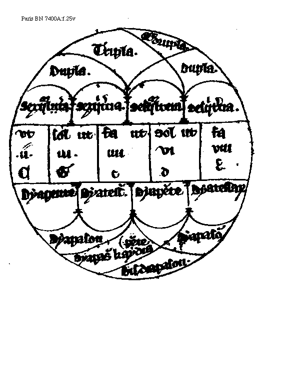 [Paris BN 7400A:f.25v; text: Dupla. Tripla. Quadrupla. Sexqualtera. Sexquitertia. ut, sol ut, fa ut, fa, .II. III. IIII. VI. VIII. C, G, c, d, cc, Dyapente, Dyatessaron. Dyapason, Dyapason kay diapente, Bisdiapason.]