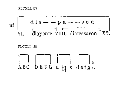 [PLCXLI:437; text: ut diapason. VI. diapente VIIII. diatessaron XII.]