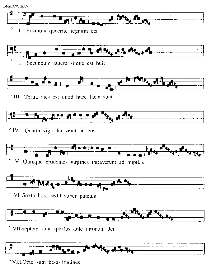 [DMA A/VIIIa:95,2; text: Sapientia, Lux fulgebit, Octo sunt beatitudines, Domine in virtute, Miserere, Servite, evovae, Hoc est praeceptum meum, In sole, Nos qui vivimus]