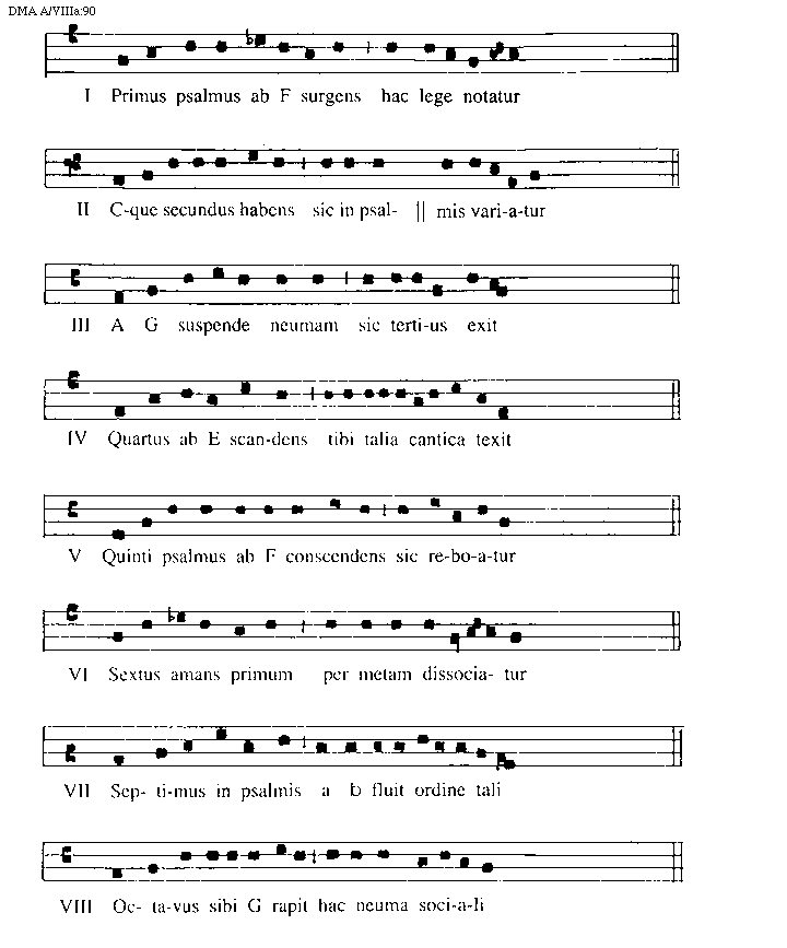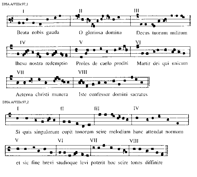 [DMA A/VIIIa:97,2; text: Si quis singulorum cupit tonorum, scire melodiam, hanc attendat normam, et sic fine brevi, studioque levi, poterit hoc scire, tonos diffinire, I, II, III, IV, V, VI, VII, VIII]