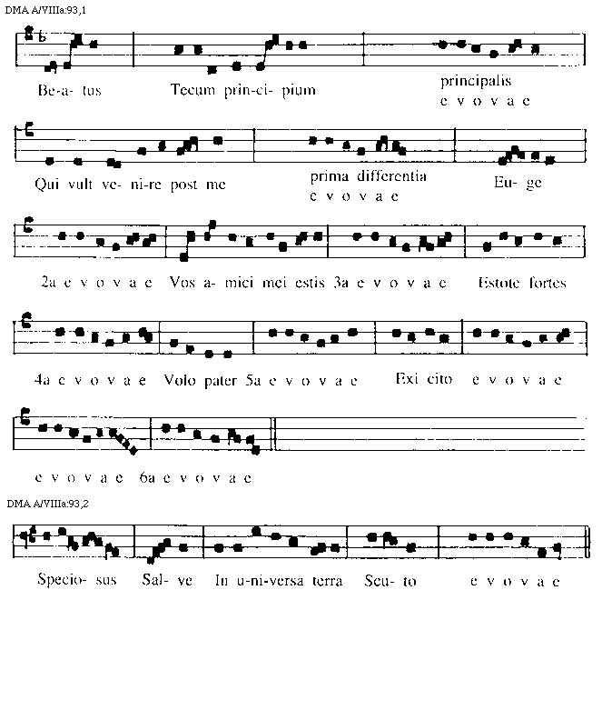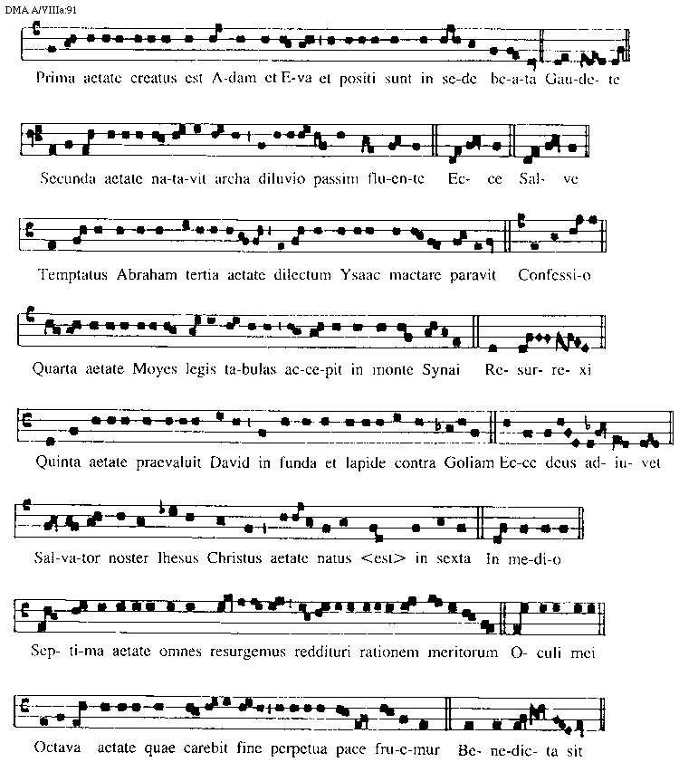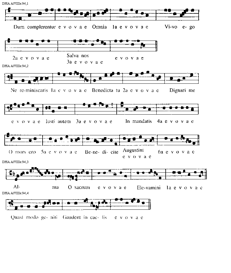 [97][DMA A/VIIIa:97,1; text: I, II, III, Beata nobis gauda, O gloriosa domina, Decus tuorum militum, Ihesu nostra redemptio, Proles de caelo proditi, Martir dei qui unicum, Aeterna christi munera, Iste confessor domini sacratus, IV, V, VI, VII, VIII]