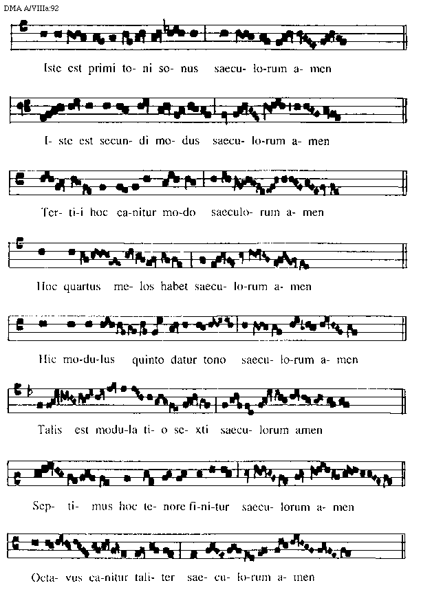 Post hoc sciendum quod et taliter toni denominantur: primus enim dicitur dorius, secundus ypodorius, tertius frigius, quartus ypofrigius, quintus lidius, sextus ypolidius, septimus mixolidius, octavus ypomixolidius. Unde versus:
