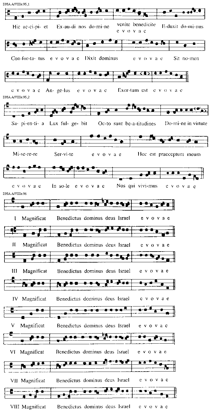 [96][DMA A/VIIIa:96; text: I Magnificat, Benedictus dominus deus Israel, evovae, II, III, IV, V, VI, VII, VIII]