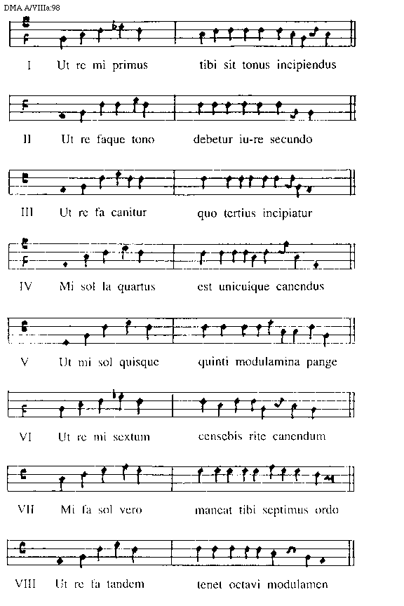 [98][DMA A/VIIIa:98; text: I Ut re mi primus tibi sit tonus incipiendus, M 39v, II Ut re faque tono debetur iure secundo, III Ut re fa canitur quo tertius incipiatur, IV Mi sol la quartus est unicuique canendus, V Ut mi sol quisque quinti modulamina pange, VI Ut re mi sextum censebis rite canendum, VII Mi fa sol vero maneat tibi septimus ordo, VIII Ut re fa tandem tenet octavi modulamen]