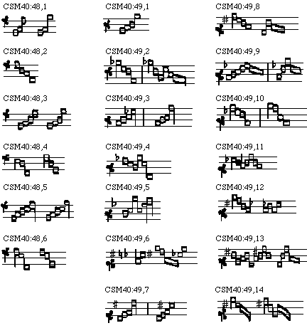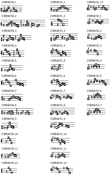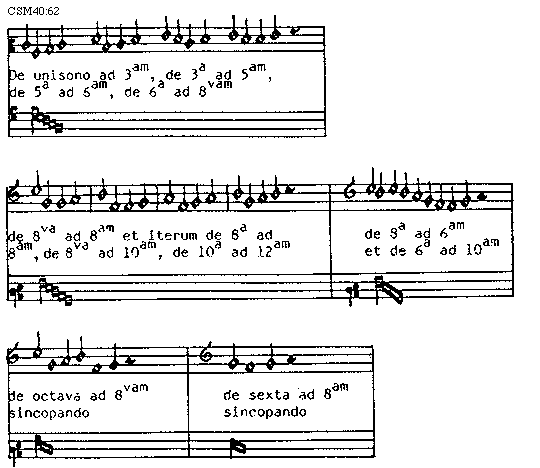 [CSM40:62; text: De unisono ad tertiam, de tertia ad quintam, de quinta ad sextam, de sexta ad octavam; de octava ad octavam et iterum de octava ad octavam, de octava ad decimam, de decima ad duodecimam; de octava ad sextam et de sexta ad decimam; de octava ad octavam sincopando; de sexta ad octavam sincopando]