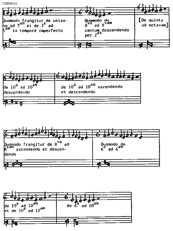 [CSM40:61; text: Quomodo frangitur de unisono ad tertiam et de tertia ad quintam in tempore imperfecto; Quomodo de octava ad octavam cantum descendendo per duas; [De quinta ad octavam]; de decima ad decimam descendendo; de decima ad decimam ascendendo et descendendo; Quomodo frangitur de octava ad octavam ascendendo et descendendo; Quomodo de sexta ad sextam; de decima ad decimam et de decima ad duodecimam; de sexta ad decimam]