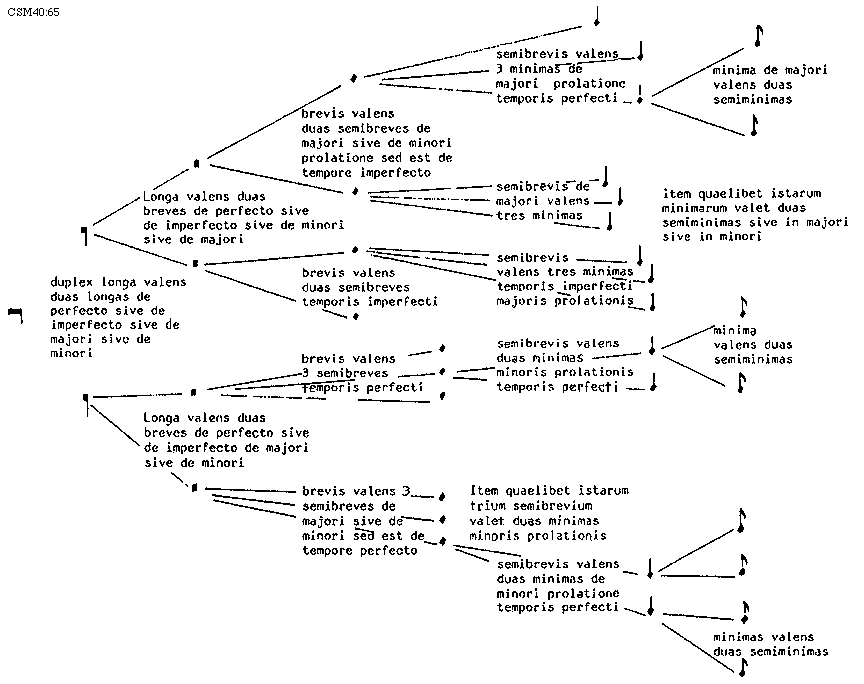 [65][CSM40:65; text: duplex longa valens duas longas de perfecto sive de imperfecto sive de majori sive de minori, longa valens duas breves de perfecto sive de imperfecto sive de minori sive de majori, longa valens duas breves de perfecto sive de imperfecto de majori sive de minori, brevis valens duas semibreves de majori sive de minori prolatione sed est de tempore imperfecto, brevis valens duas semibreves temporis imperfecti, brevis valens tres semibreves temporis perfecti, brevis valens tres semibreves de majori sive de minori sed est de tempore perfecto, semibrevis valens tres minimas de majori prolatione temporis perfecti, semibrevis de majori valens tres minimas, semibrevis valens tres minimas temporis imperfecti majoris prolationis, semibrevis valens duas minimas minoris prolationis temporis perfecti, Item quaelibet istarum trium semibrevium valet duas minimas minoris prolationis, semibrevis valens duas minimas de minori prolatione temporis perfecti, minima de majori valens duas semiminimas, Item quaelibet istarum minimarum valet duas semiminimas sive in majori sive in minori, minima valens duas semiminimas, minimas valens duas semiminimas]