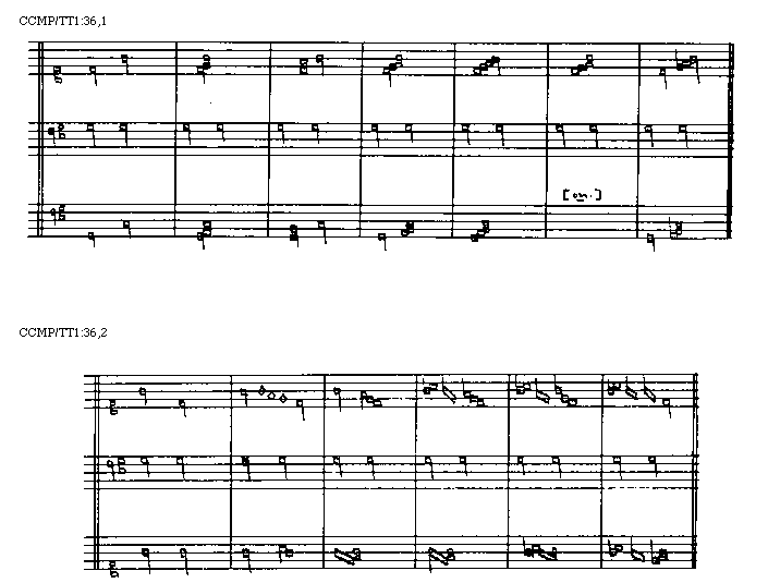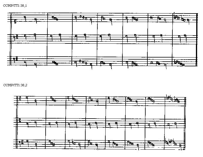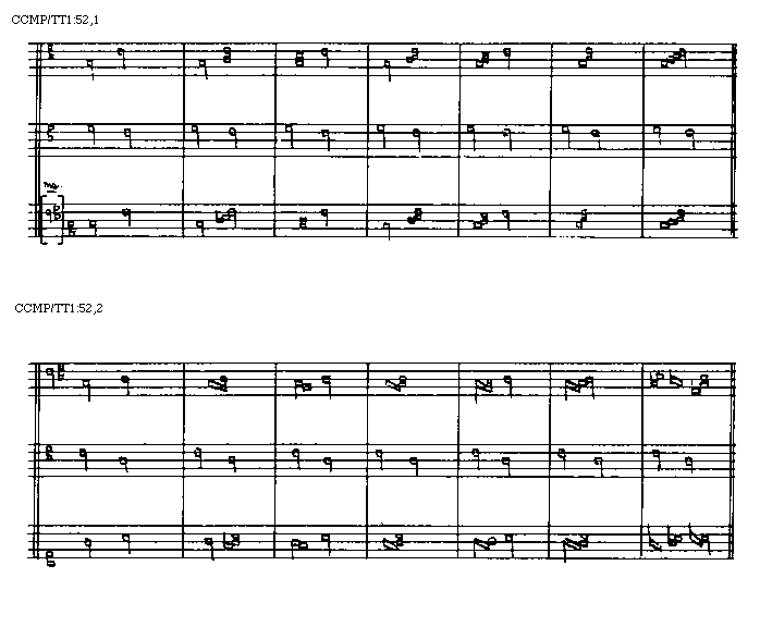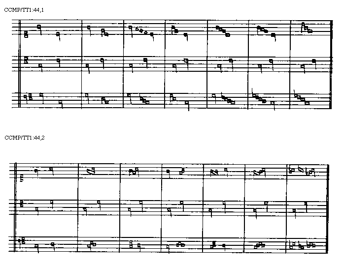 [42]Ad ascensum trium, incipiens in diapason supra vel in diapente infra, fac unisonum, ut hic: