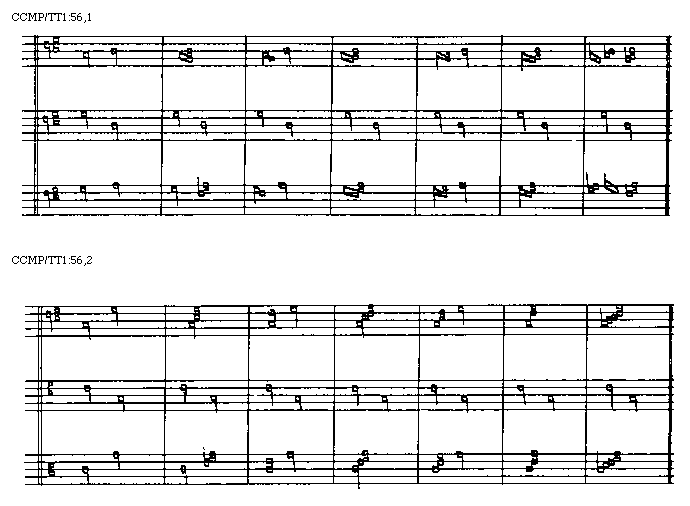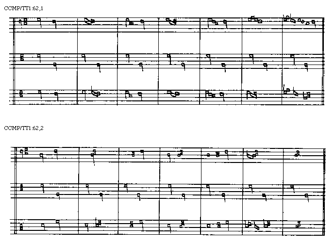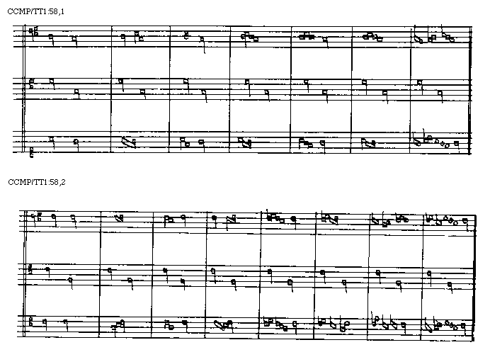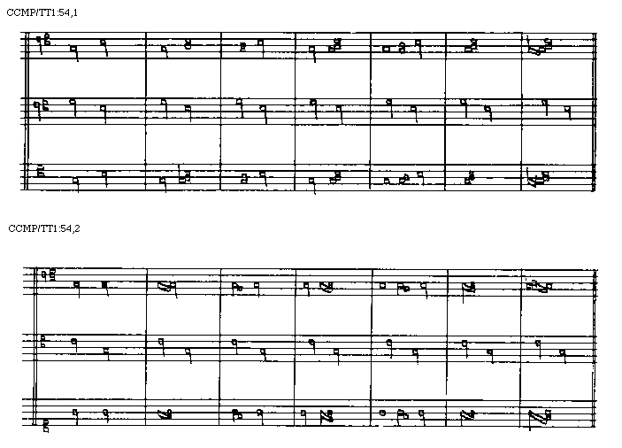 [8]Quandocumque duae semibreves inter duas longas vel breves [ms.: longas] inveniuntur, prima habebit unum tempus semibreve, secunda duo tempora semibrevia, ut hic: