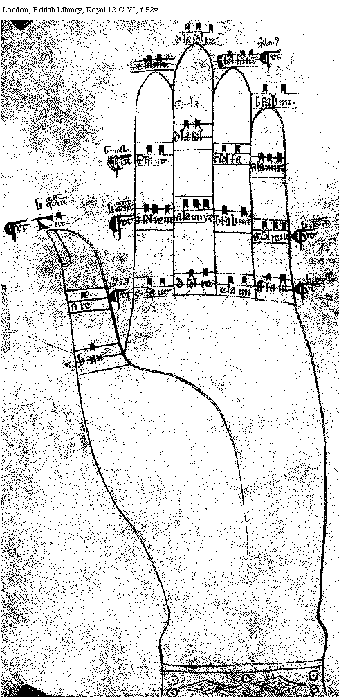 [f.52v][London, British Library, Royal 12.C.VI, f.52v; text: [Gamma] vt, A re, B mi, c fa vt, D sol re, e la mi, F fa vt, g sol re vt, b fa b mi, A la mi re, d la sol, c sol fa, c sol fa vt, d la sol re, E la, proprius cantus, b molle, [sqb] quadratum]