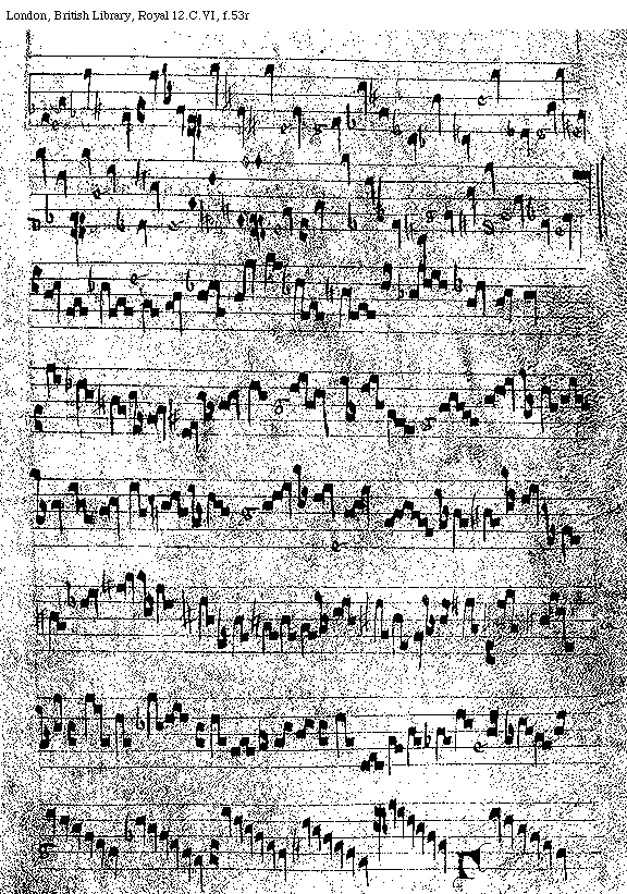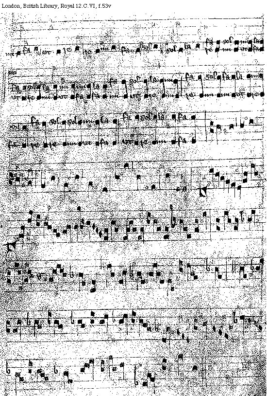 [f.53v][London, British Library, Royal 12.C.VI, f.53v; text: vt, re, mi, fa, sol, [rob], [rob][rob], g, #, [Gamma]]