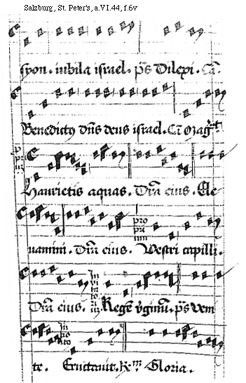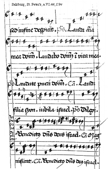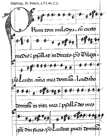 [Salzburg, St. Peter's, a.VI.44, f.1r; text: Primi toni melodya. cum erecto medio: psallat in directo. psalmus Dilexi. psalmus Lauda anima mea dominum. Laudabo dominum in vita mea; psallam deo meo quam diu fuero. psalmus Laudate pueri dominum.]