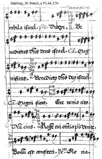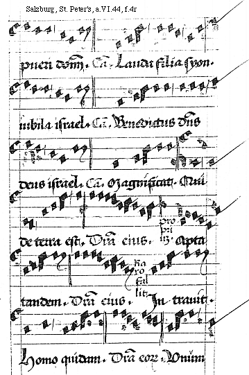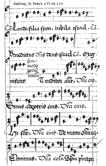 [f.1v][Salzburg, St. Peter's, a.VI.44, f.1v; text: Canticum Lauda filia Syon. iubila Israel. Canticum Benedictus dominus deus Israel Canticum. Magnificat, primo modo proprium inicium. Traditor autem. Differencia eius. Stans a dextris eius. Hi sunt. De manu omnium Dominus. Differencia eorum. Spiritu principa]