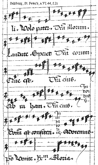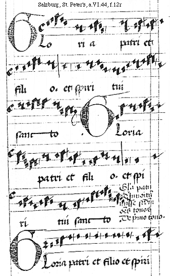 [f.12r][Salzburg, St. Peter's, a.VI.44, f.12r; text: Gloria patri et filio. et spiritui sancto. Gloria patri ad Introitum misse secundum omnes tonos, De primo tono.]