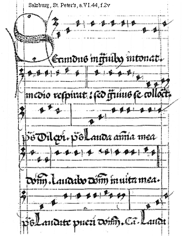 [Salzburg, St. Peter's, a.VI.44, f.2v; text: Secundus in grauibus intonat. medio respirat: sed grauius se collocat. psalmus Dilexi. Lauda anima mea dominum. Laudabo dominum in uita mea. Laudate pueri dominum. Canticum. Lauda]