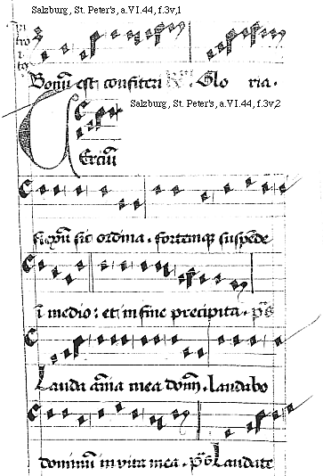 [f.3v][Salzburg, St. Peter's, a.VI.44, f.3v,1; text: Introitus. Bonum est confiteri Responsorium. Gloria.]