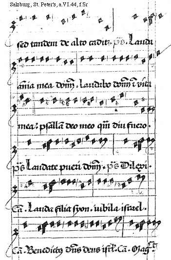 [f.5r][Salzburg, St. Peter's, a.VI.44, f.5r; text: sed tandem de alto cadit. psalmus. Lauda anima mea dominum. Laudabo dominum in vita mea: psallam deo meo quam diu fuero. psalmus, Laudate pueri dominum. Dilexi. Canticum. Lauda filia Syon. iubila Israel. Benedictus dominus deus Israel. Magnificat.]