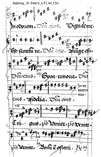 [f.5v][Salzburg, St. Peter's, a.VI.44, f.5v; text: proprium. In odorem. Differencia eius. propria. Dignare me. antiphona, Est secretum va. Differencia eorum. Frange esu. Syon renova. Fidelia. Invitatorium. Cristus. psalmus, Venite. Introitus. Bonum est confiteri. Responsorium.]