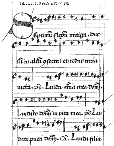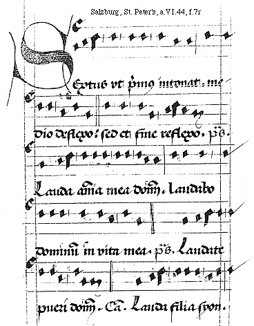 [Salzburg, St. Peter's, a.VI.44, f.7r; text: Sextus vt primus intonat. medio deflexo: sed et fine reflexo. psalmus, Lauda anima mea dominum. Laudabo dominum in vita mea. Laudate pueri dominum. Canticum. Lauda filia Syon.]
