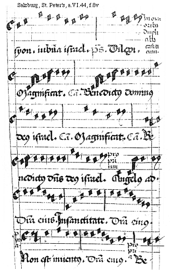 [f.8v][Salzburg, St. Peter's, a.VI.44, f.8v; text: Syon. iubila Israel. psalmus, Dilexi. In maioribus duplicibus canticum. Magnificat. Canticum. Benedictus dominus deus Israel. proprium, Angelus ad. Differencia eius. In sanctitate. propria. Non est inuentus. Be-]