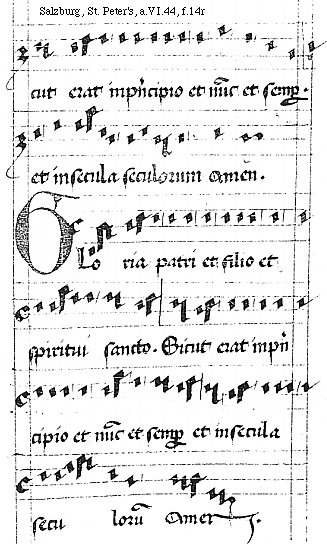 [f.14r][Salzburg, St. Peter's, a.VI.44, f.14r; text: cut erat in principio et nunc et semper. Gloria patri et filio et spiritui sancto. Sicut erat in principio et nunc et semper. et in secula seculorum Amen.]