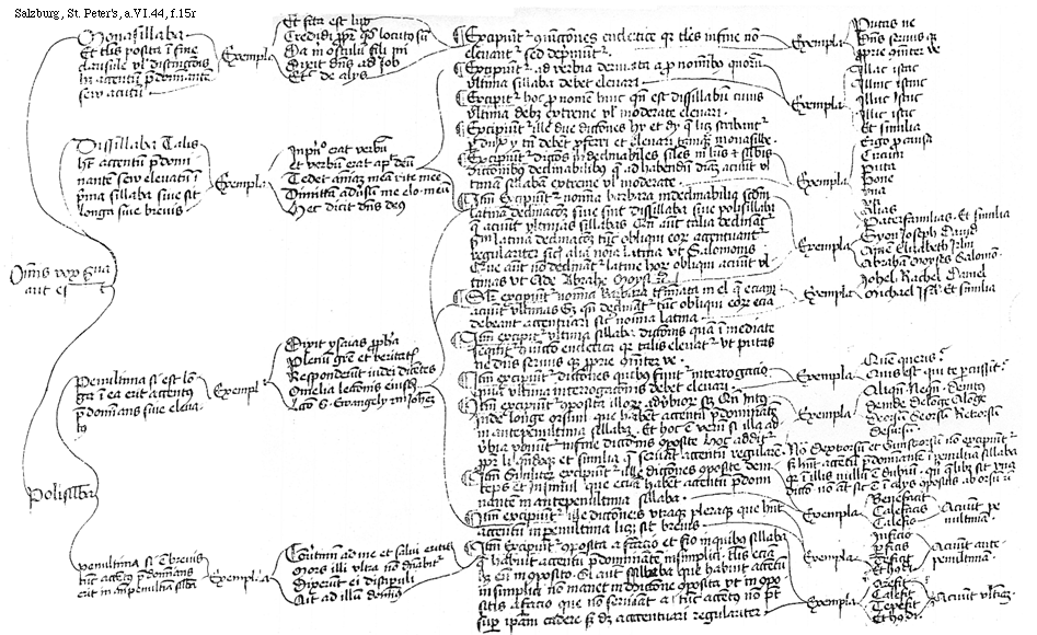 [f.15r][Salzburg, St. Peter's, a.VI.44, f.15r; text: Omnis vox serua aut est, Monasillaba. Et talis posita in fine clausule vel distinccionis habet accentum predominantem seu acutum, Dissillaba Talis habet accentum predominantem sew eleuatum in prima sillaba siue sit longa siue breuis, Polisillaba, Penultima si est longa in ea erit accentus predominans siue eleuatus, penultima si est breuis tunc accentus predominans erit in antepenultima sillaba, Exempla, Et facta est lux, Credidi propter quod locutus sum, Da michi osculum fili mi, Dixit dominus ad Iob, Et cetera de allis, In principio erat verbum et verbum erat aput deum, Tedet animam meam vite mee, Dimittam aduersum me eloquium meum, Hec dicit dominus deus, Dixit Ysaias propheta, Plenum gracie et veritatis, Responderunt iudei dicentes, Omelia lectionis eiusdem, Leccio Sancti Ewangely secundum Iohannem, Convertimini ad me et salvi eritis, Mors illi vltra non dominabitur, Dixerunt ei discipuli, Ait ad illum dominus, Excipiuntur coniunctiones encletice quia tales in fine non eleuantur sed deprimuntur. Excipiuntur ad verbia deriuata a pro nominibus quorum vltima sillaba debet eleuari. Excipitur hic pro nomen huic quando est dissillabum cuius vltima debet extreme vel moderate eleuari. Excipiuntur ille due dicciones hy et dy que licet scribantur per dux y tamen debent proferri et eleuari tamquam monasilbe. Excipiuntur dicciones indeclinabilis similes in litteris et sillabis diccionibus declinabilibus que ad habendum differenciam acuunt vltimam sillabam extreme vel moderate. Item Excipiuntur nomina barbara indeclinabilia secundum latinam declinacionem siue sint dissillaba siue polisillaba que acuunt vltimas sillabas Quando autem talia declinantur secundum latinam declinacionem tunc obliqui eorum accentuantur regulariter sicut alia nomina latina vt Salamonis Que autem non declinantur latine horum obliqui acuunt vltimas vt Ade Abrahe Moysi et cetera, Similiter excipiuntur nomina barbara terminata in el que eciam acuunt vltimas Sed quando declinantur tunc obliqui eorum eciam debeant accentuari sicut nomina latina. Item excipiuntur vltima sillaba diccionis quam immediate sequitur coniunctio encletica quia talis elevatur vt putas ne dominus seruus que proprie communiterve. Item excipiuntur dicciones quibus finitur interrogacio quam vltima interrogacionis debet elevari. Item excipiuntur composita illorum adverbiorum scilicet Quando Intus Inde longe orsum que habent accentum predominantem in antepenultima sillaba. Et hoc est verum si illa adverbia ponuntur in fine diccionis composite Hoc additur propter li quandoque et similia que seruant accentum regularem. Item similiter excipiuntur ille dicciones composite deinceps et In simul que eciam habent accentum predominantem in antepenultima sillaba. Item excipiuntur ille dicciones vtraque pleraque que habent accentum in penultima licet sit breuis. Item excipiuntur composita a facio et fio in quibus sillaba que habuit accentum predominantem in simplici. talis eciam habet eum in composito. Si autem sillaba que habuit accentum in simplici non manet in diccione composita vt in compositis a facio que non seruant a tunc accentus non potest super ipsam cadere sed debet accentuari regulariter. Putas ne, Dominus seruus que proprie communiterve, Illac istac, Illinc istinc, Illuc istuc, Illic istic, Et similia, Ergo pro causa, Circum, Puta, Pone, vna, vti, Alias, Paterfamilias. Syon, Ioseph, David, Amen, Elizabeth, Ierusalm, Abraham, Moyses, Salomon. Iohel, Rachel, Daniel, Michael, Israel. Quem queris? Quis est qui te percussit? Aliquando, Nequando, Deintus, Deinde, Delonge, Alonge, Deorsum, Seorsum, Retrorsum, Desursum. Nota Dextrorsum et Sinistrorsum non excipiuntur sed habent accentum predominantem in penultima sillaba quia in illis nullum est dubium. quin quelibet sit vna diccio non autem sic est in alys compositis ab orsum et cetera, Benefacit, Calefacis, Calefio, Inficio, Perficis, Deficit, Et huiusmodi, Orefit, Calefit, Tepefit, Acuunt penultimam. Acuunt antepenultimam. Acuunt vltimam.]