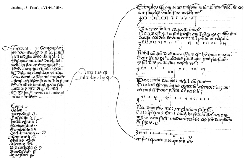 [f.15v][Salzburg, St Peter's, a.VI.44, f.15v,1; text: Item De Accentu Semiduplari. Eciam Semiduplaris quia habet tantum fieri indistinccione clausularum. Distinccio accentus duplaris in triplaris habet fieri et Ewangelis. Vnde Accentus secundum Boecium Est distinccio clausularum punctuacionem oracionum considerans mediante ascensu et descensu cuiuslibet signi Eciam ab ad et cantus. proprium est accentus intendi vel remitti. Et ideo simplex nomen erit accentus cum non intenditur, Coma, Colon, Peryodus, Suspensiuus, Interrogatiuus, Semipunctus, Semipunctus, Exclamatiuus, Admiratiuus, Obelus, Astericus, Parenthesis, Sinodoche, Apposicio, Simplex Est qui facit unisonum in sua punctuacionem. Et eius erit simplex punctum sine versali ut sic, Quare de wlua eduxisti me? et cetera, Grauis est qui in suo gressu quintam facit eo quod omne graue deorsum tendit. Et eius erit vnum punctum cum versali. Nichil enim sunt dies mei. Quid est homo quia magni. Semigrauis dicitur medius grauis qui terciam sub facit cuius sunt duo puncta sine versali ut sic: Parce michi domine: nichil enim sunt, Acutus Est qui in suo descensu ascendit in terciam et eius sunt duo puncta cum versali: Nec dimittis me: vt gluciam saliuam. Circumflexus est qui eandem habet forma sicut acutus nisi quod secundam facit mediocriter Et eius sunt duo puncta cum signo .C. et sic repente precipitas me.]