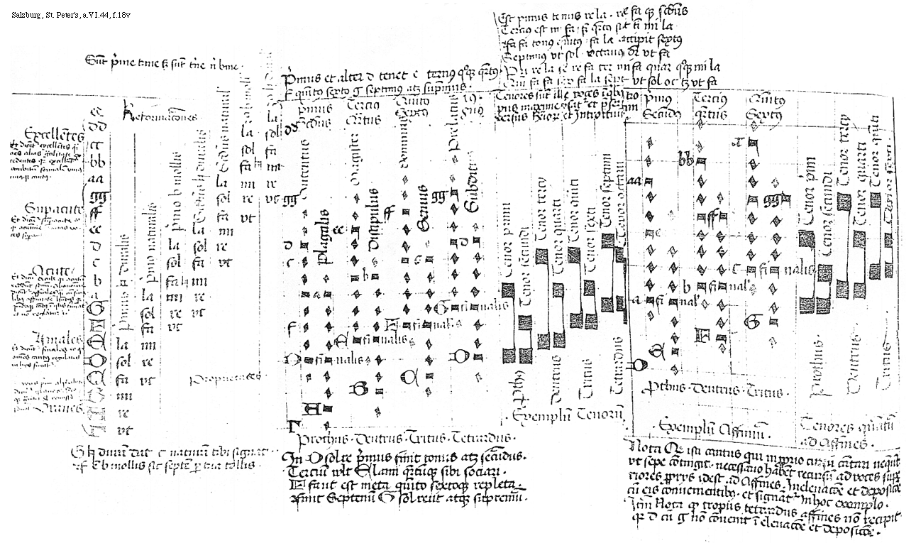 [f.18v][Salzburg, St. Peter's, a.VI.44, f.18v; text: Graues, [quasi voces primi aphabeti dicuntur graves. Ideo quia grauiter et remisse sonant. m.rec.], Finales, [Et dicuntur finales eo quod omnes cantus regulares in hys finiantur m.rec.], Acute, [Et dicuntur acute quia acutum reddunt sonum. Alio nomine dicuntur affinales quasi cum finalibus affinitatem habentes quia quandoque cantus in istis terminatur et non regulatur et cetera m.rec.], Superacute, [Et dicuntur superacute eo quod acumine acutas voces superant. m.rec.], Excellentes, [Et dicuntur excellentes quasi omnes alias generalitate procedentes quia excellunt ambitum formalem uniuscuiusque cantus. m.rec.], [Gamma], A, B, C, D, E, F, G, a, b, c, d, ee, ff, gg, aa, bb, cc, dd, vt, re, mi, fa, sol, la, [sqb] mi, Primus [sqb] duralis, Primus naturalis, Primus b mollis, Secundus [sqb] duralis, Secundus naturalis, Secundus b mollis, Tercius [sqb] duralis, Sunt prime trine sed sunt trine nec bine. Reformaciones, Proprietates, G [sqb] durum dat c naturam tibi signat et F est b mollis sic septem per tria tollis. Primus et alter d tenet c ternus quoque quartus. f quintus sextus g septimus atque supremus. Primus, Secundus, Tercius, Quartus, Quintus, Sextus, Septimus, Octauus, Autentus, Magister, Dominus, Prelatus, Plgalis, Discipulus, Seruus, Subditus, finalis, Prothus. Deutrus. Tritus. Tetrardus. In Dsolre primus finit tonus atque secundus. Tercium wlt Elami quartumque sibi sociari. Efaut est meta quinto sextoque repleta. Finit Septenum Gsolreut atque supremum. Est primus tonus re la. re fa que secundus Tercius est mi fa sed quartus sit in mi la Fa fa tonus quintus fa la accipit sextus Septimus vt sol Octauus dicitur vt fa, Pri re la se re fa ter mi fa quar quoque mi la Quin fa fa sex sit la sept vt sol oc tenet vt fa, Tenores sunt ille voces in quibus tropus maxime vsatur et presertim versus Responsoriorum et Introituum, Tenor primi, Tenor secundi, Tenor tercy, Tenor quarti, Tenor quinti, Tenor sexti, Tenor septimi, Tenor octaui .Exemplum Tenorum. .Exemplum Affinium. Tenores quantum ad Affines. Nota Quod isti cantus qui in proprio cursu cantari nequeunt vt sepe contingit. necessario habent recursum ad voces superiores proprys id est ad Affines. In eleuacione et deposicione cum eis conuenientibus. et signantur In hoc exemplo. Item Nota quod tropus tetrardus affines non recipit quia d cum g non conuenit in eleuacione et deposicione.]