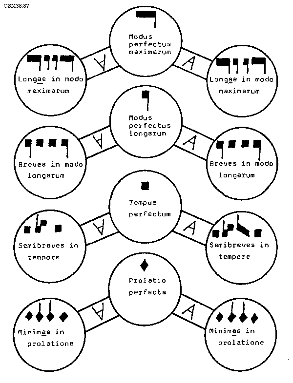 [CSM38:87; text: Modus perfectus maximarum, Modus perfectus longarum, Tempus perfectum, Prolatio perfecta, Longae in modo maximarum, Breves in modo longarum, Semibreves in tempore, Minimae in prolatione, A]