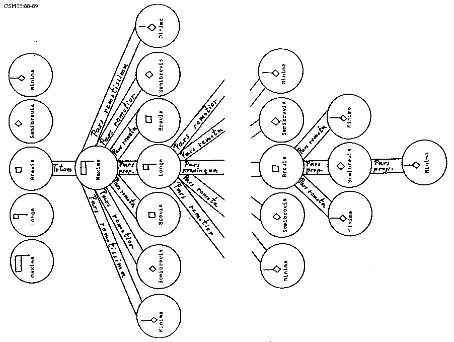 [88-89][CSM38:88-89; text: Maxima, Longa, Brevis, Semibrevis, Minima, Totum, Pars propinqua, Pars remota, Pars remotior, Pars remotissima]