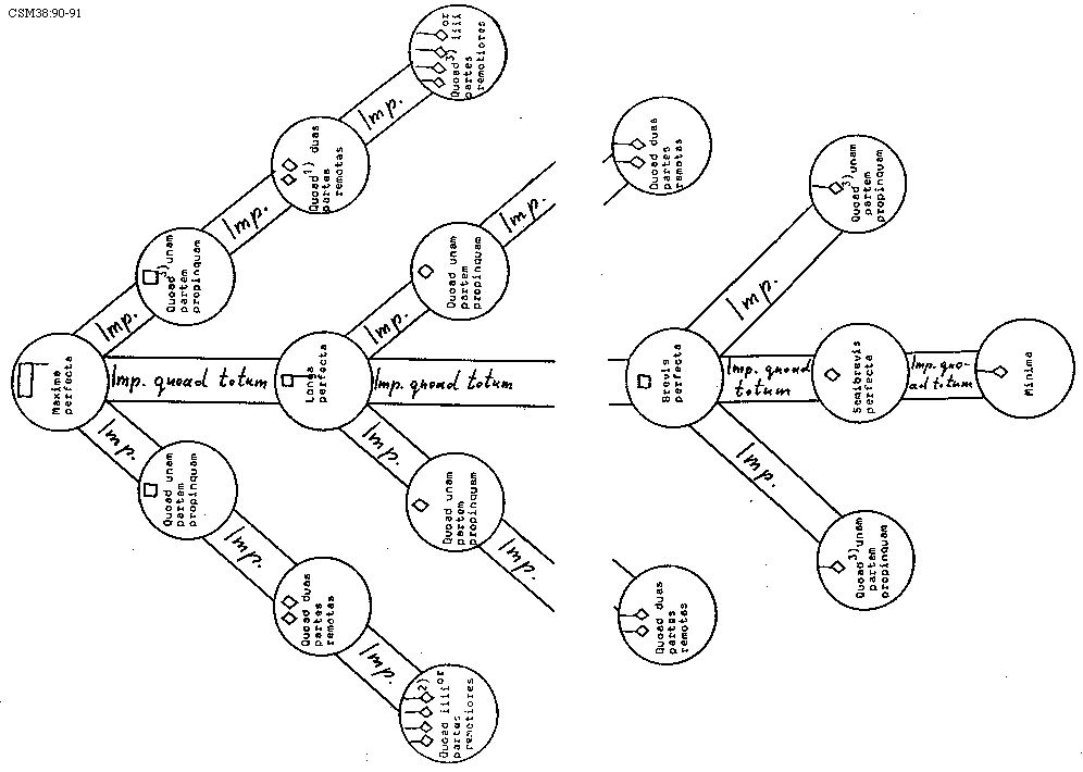 [90-91][CSM38:90-91; text: Maxima perfecta, Longa perfecta, Brevis perfecta, Semibrevis perfecta, Minima, Imperfectio, Imperfectio quoad totum, Quoad unam partem propinquam, Quoad duas partes remotas, Quoad quatuor partes remotiores]