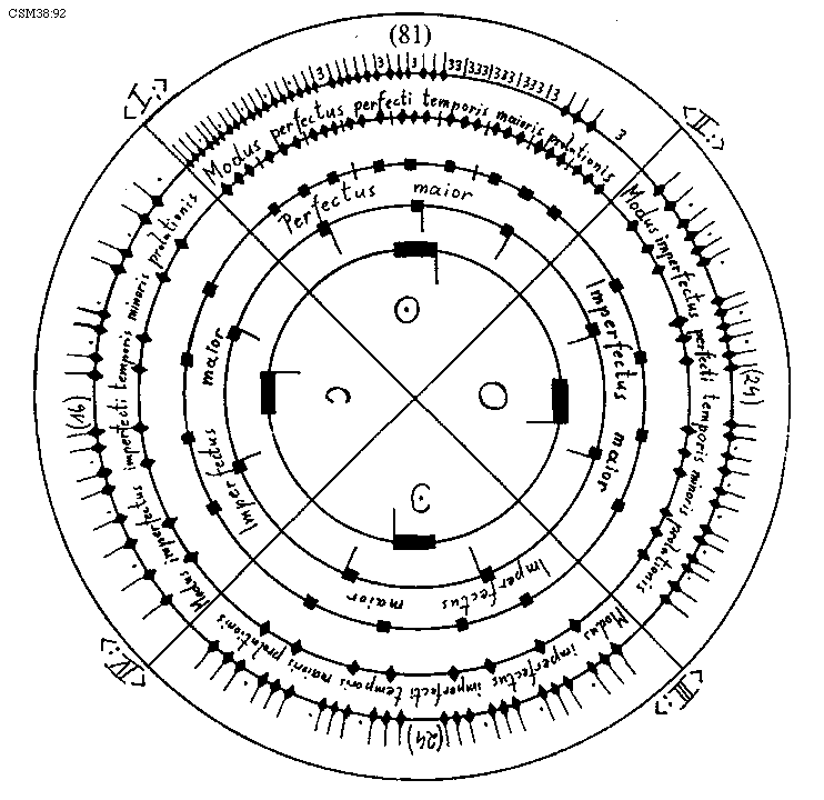[CSM38:92; text: Modus perfectus perfecti temporis maioris prolationis, Modus imperfectus perfecti temporis minoris prolationis, Modus imperfectus imperfecti temporis maioris prolationis, Modus imperfectus imperfecti temporis minoris prolationis, Perfectus maior, Imperfectus maior, 16, 24, 81, I:, II:, III:, IV:, 3, 33, 333]