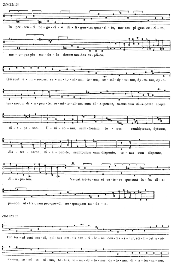 [ZfM12:135; text: Ter terni sunt modi, quibus omnis cantilena contexitur, scilicet unisonus, semitonium, tonus, semidytonus, dytonus, diatessaron]