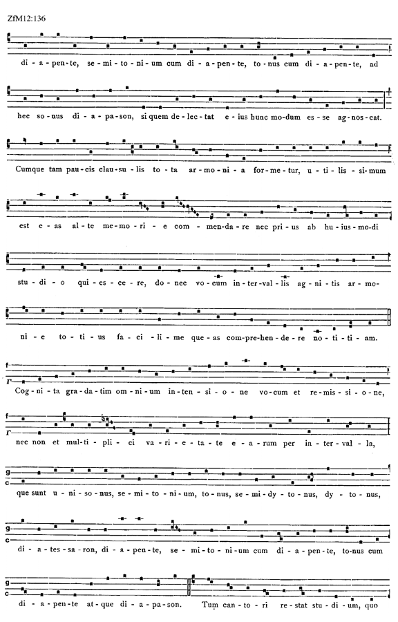 [136][ZfM12:136; text: diapente, semitonium cum diapente, tonus cum diapente, ad hec sonus diapason, si quem delectat eius hunc modum esse agnoscat. Cumque tam paucis clausulis tota armonia formetur, utilissimum est eas alte memorie commendare nec prius ab huiusmodi studio quiescere, donec vocum intervallis agnitis armonie totius facilime queas comprehendere notitiam. Cognita gradatim omnium intensione vocum et remissione, nec non et multiplici varietate earum per intervalla, que sunt scilicet unisonus, semitonium, tonus, semidytonus, dytonus, diatessaron, diapente, semitonium cum diapente, tonus cum diapente atque diapason. Tum cantori restat studium, quo]