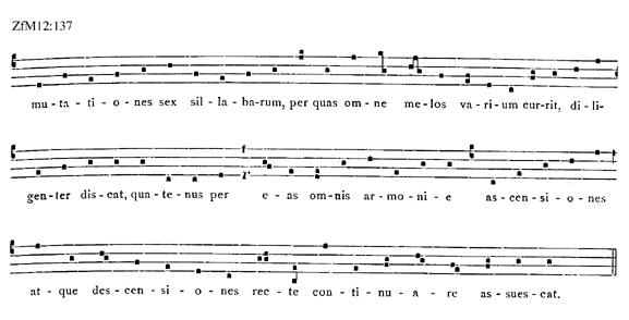[137][ZfM12:137; text: mutationes sex sillabarum, per quas omne melos varium currit, diligenter discat, quatenus per eas omnis armonie ascensiones atque descensiones recte continuare assuescat.]