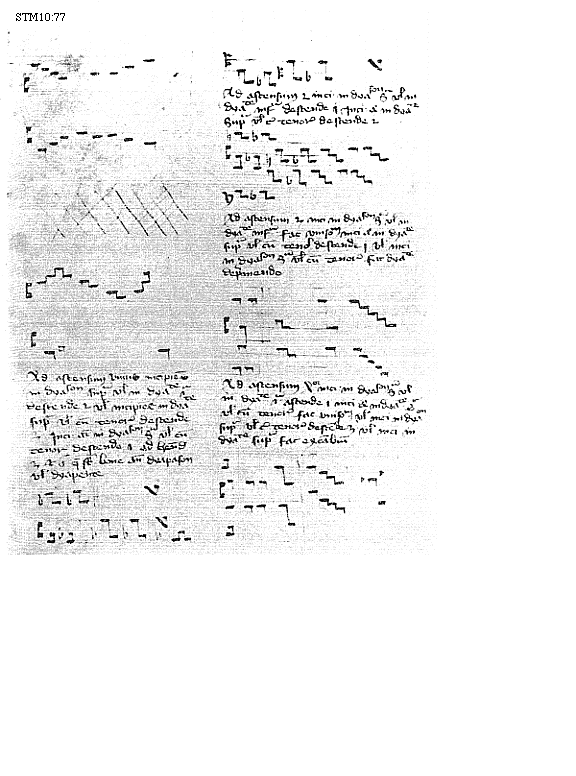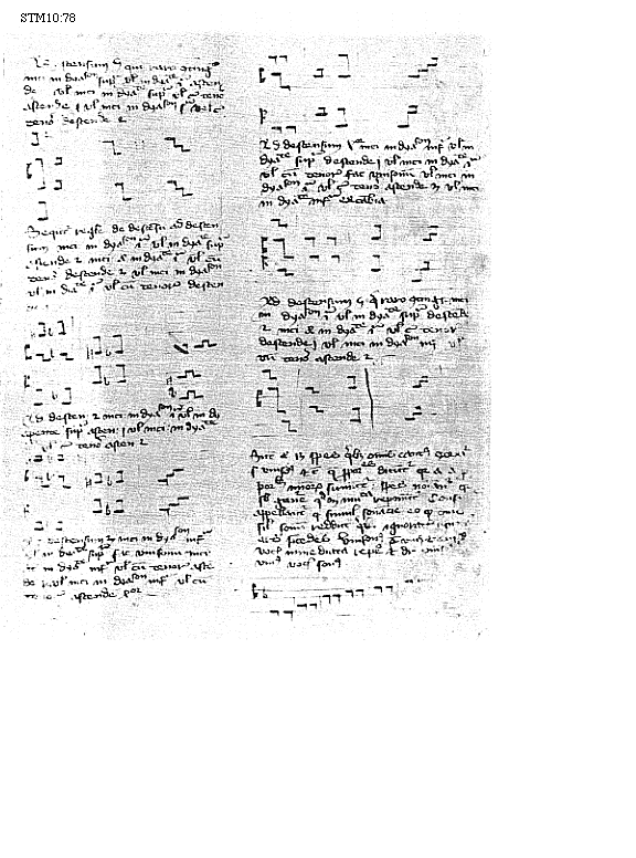 [70]scilicet proprietas et improprietas et opposita proprietas acceduntur (hs.: accenduntur) in principio ligaturae. Istae uero duae differentiae, scilicet perfectio et imperfectio, acceduntur (hs.: accenduntur) in fine. Proprietas et improprietas [! = sine proprietate] dicunt priuatione huius, perfectio et imperfectio idem dicunt sed in fine differunt. Ligatura descendens, habens tractum descendentem a parte sinistra, cum proprietate dicitur (fig. Nr 55) [Lig2cdsnd,Lig2odcddx(!),Lig3cdsndod,Lig3cdsnodart], carens uero sine [proprietate] (fig. Nr 54) [Lig2d,Lig2od,Lig3dod,Lig3odart]. Ascendens autem ligatura et descendens, habentes tractus desuper uenientes, cum opposita proprietate dicitur (fig. Nr 56) [Lig3cssnaart,Lig2cssna,Lig4cssnaodart,Lig2cssnod,Scssnodx,S,S(!),Lig3cssndod]. Notandum: omnis ligatura cum proprietate est [prima] breuis, secunda longa; cum opposita proprietate semibreuis tamen secunda. Omnis media breuis, nisi per oppositam proprietatem semibreuis fiat, quia nulla sola semibreuis inuenitur. Vltima omnis ligaturae [rectae?], stans supra (hs.: secundum) primum et penultimum uel sub (hs.: sn = sine) primo et penultimo, est longa et dicitur cum perfectione (fig. Nr 57) [Lig2art,Lig3aart,Lig4aodart,Lig2cdsnd]. Vltima omnis ligaturae obliquae, stans supra primum uel penultimum, uel sub (hs.: sine) primo uel penultimo, est breuis et dicitur sine perfectione (fig. Nr 58) [Lig2a,Lig5aadoacddx; Lig2cdsnod,Lig4cdsnoddod;]. Opposita tamen proprietas est signum semibreuitatis duarum (fig. Nr 59) [Lig3cssnaart,Lig2cssna; Lig2cssnod,Lig3cssndod]. Dupliciter fit obliquitas ascen[den]do: si auerso capite cuius ultima [imperfecta est]; si plicatur a parte dextra longa est (fig. Nr 60) [Lig2acddx]; si uero plicetur a parte sinistra ascendendo breuis est. Alia uero fit obliquitas ascendendo in (hs.: cum) uno corpore. Nec est neccessarium, nisi quando debet plica breuis fieri ascendendo (hs. descendendo). Sunt (hs.: sunt non) omnes ligaturae plicabilae in fine, tam ascendendo quam descendendo (fig. Nr 61) [Lig2d,Lig3cssnddcsdx,Lig2a,Lig3aa; Lig2odcsdx,Lig4cssnaaodcsdx]. Valor plicarum in temporibus cognoscitur ex praedictis, et[iam] ligaturarum. Ligaturarum primae uel ultimae taliter posset duplicari [(fig. Nr 62)] [Lig3ad, Lig3dd, Lig3cssnaacsdx,Lig2art,Lig2d,Lig3ddrt,Lig3MXart(!)] [? = ... taliter posset dupliciter plicari?].