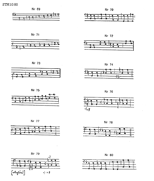 [71]et caetera (fig. Nr 63) [L,B,L,B,L,B,L,B,L], secundus [modus] e contrario (fig. Nr 64) [B,L,B,L,B; B,L,B], tertius ex longa et duabus breuibus et longa et caetera (fig. Nr 65) [L,B,B,L,B,B,L], quartus e conuerso (fig. Nr 66) [B,B,L,B,B,L,B,B,L,B], quintus ex omnibus longis (fig. Nr 67) [L,L,L,L,L,L], sextus e contrario, scilicet ex omnibus breuibus et semibreuibus (fig. Nr 68) [B,B,B,S,S,B; B,B,B,S,S,S,B].