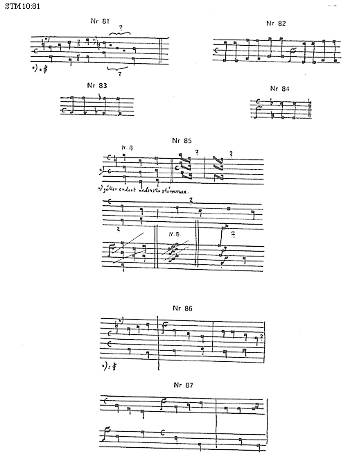 [72]quae immensurabilis appellatur. Pausae semibreuis minoris et maioris habetur differentia quoad situm. Vnum si ponatur cum semibreuem notam, tunc est minor; si uero postponatur tantum est maior. Modi diuisio sic formata [?] nihil ualet de se, sed dat aliis significare. Suspirium, sic formatum: /, est signum breuiter hanelitum [* * *] retrahendi. Acceptio syllabarum, sic formata: \, est signum acci[pien]di syllabam.