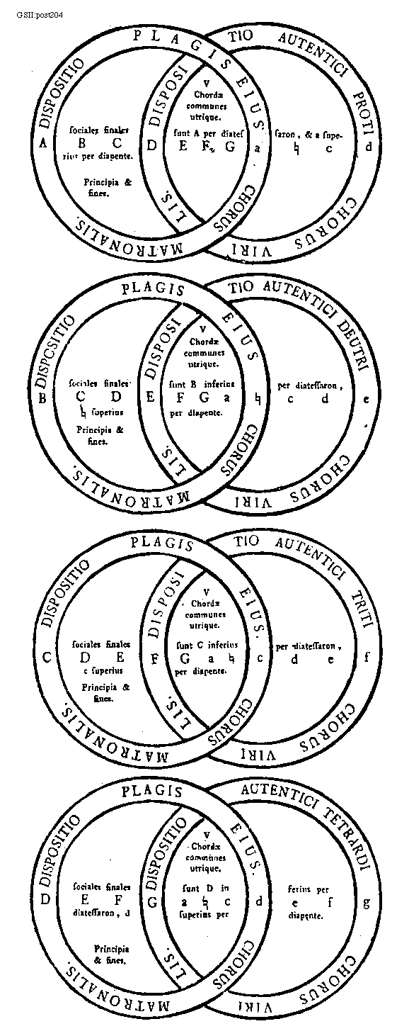 [GSII:post204; text: Dispositio plagis eius chorus matronalis. Dispositio autentici proti chorus virilis. V Chordae communes utrique. sociales finales sunt A per diatessaron, et a superius per diapente. Principia et fines. A, B, C, D, E, F, G, a, [sqb], c, d, e, f, g, Dispositio autentici deutri chorus virilis. sociales finales sunt B inferius per diatessaron, [sqb] superius per diapente. Dispositio autentici triti chorus virilis. sociales finales sunt C inferius per diatessaron, c superius per diapente. Dispositio autentici tetrardi chorus virilis. sociales finales sunt D inferius per diatessaron, d superius per diapente.]
