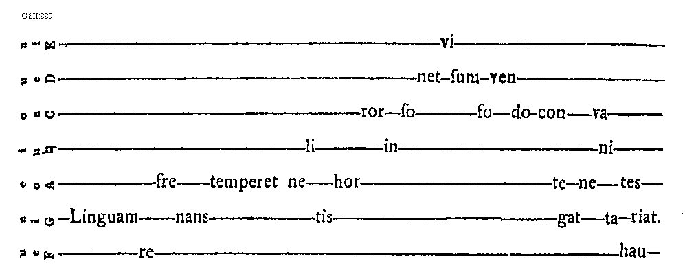 [GSII:229; text: a, e, i, o, u, A, [sqb], C, D, E, F, G, Linguam refrenans temperet ne litis horror in sonet visum fovendo contegat ne vanitates hauriat.]