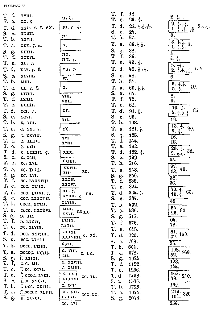 [PLCLI:657-58; text: Tonus, Semitonium, f. e. d. c. b. a. g. XVIII. XX. [zeta]. XXII. [stigma]. [zeta]. et caetera, XXIIII. XXVII. XXX. [zeta]. [sigma]. XXXII. XXXVI. XL. [stigma]. XLV. [stigma]. [beta]. XLVIII. LIIII. LX. [stigma]. [zeta]. LXIIII. LXXII. LXXXI. XCI. [sigma]. XCVI. C. VIII. C. XXI. [stigma]. C. XXVIII. C. XLIIII. C. LXII. C. LXXXII. [zeta]. C. XCII. CC. XVI. CC. XLIII. CC. LVI. CC. LXXXVIII. CCC. XXIIII. CCC. LXIIII. [stigma]. CCC. LXXXIIII. CCCC. XXXII. CCCC. LXXXVI. D. XII. D. LXXVI. DC. XLVIII. DCC. XXVIIII. DCC. LXVIII. DCCC. LXIIII. DCCCC. LXXII. I[macron supra lin.]. XXIIII. I[macron supra lin.]. C. LII. I[macron supra lin.]. CC. XCVI. I[macron supra lin.]. CCCC. LVIII. I[macron supra lin.]. D. XXXVI. I[macron supra lin.]. DCC. XXVIII. I[macron supra lin.]. DCCCC. XLIIII. II[macron supra lin.]. XLVIII. II. [zeta]. III. [stigma]. [zeta]. III. V. IIII. IIII. [stigma]. VII. [stigma]. VI. X. VIII. VIIII. XV. XII. XX. XVI, XVIII, XXX. XXIIII. XXVII. XIII, XXXII. XXXVI. XL. [stigma]. XVIIII. [stigma]. XLVIII. LIIII. XXVI. LXIIII. LXXII. LXXXI. XXXVIIII. XCVI. C. VIII. LII. C. XXVIII. C. XLIIII. C. LXII. LXXVIII. C. XCII. CC. XVI. C. IIII. CC. LVI, XL. LX. LXXX. C. XX. C. LX. CC. XL. CCC. XX. 18. 20. 1/4. 22. 1/2. 1/4. 1/32. 24. 27. 30. 1/4. 1/3. 32. 36. 40. 1/2. 45. 1/2. 1/16. 48. 54. 60. 1/2. 1/4. 64. 72. 81. 91. 1/8. 96. 108. 121. 1/2. 128. 144. 162. 182. 1/4. 192, 216. 243. 256. 288. 324. 364. 1/2. 384. 432. 486. 512. 576. 648 729. 768. 864. 972. 1024. 1152. 1296. 1458. 1536. 1728. 1944. 2048. 2. 1/4. 2. 1/2. 1/32. 1. 1/8 1/16. 1/32. 3. 3. 1/4. 1/8. 1. 1/2. 1/8. 4. 4. 1/2. 5. 1/16. 2. 1/4. 1/8. 1/16. 6. 6. 1/2. 1/4. 5. 1/4. 8. 9. 10. 1/8. 4. 1/2. 1/4. 1/8, 12. 13. 1/2. 6. 1/2. 16. 18. 20. 1/4. 9. 1/2. 1/4. 24. 27. 13. 32. 36. 40. 1/2. 19. 1/2. 48, 54. 26. 64. 72. 81. 39. 96. 108. 52. 128. 144. 162. 78. 192. 216. 104. 256. 3. 1/2. 1/4. 5. 7. 1/2. 10. 15, 20. 30. 40. 60. 80. 120. 160. 240. 320]