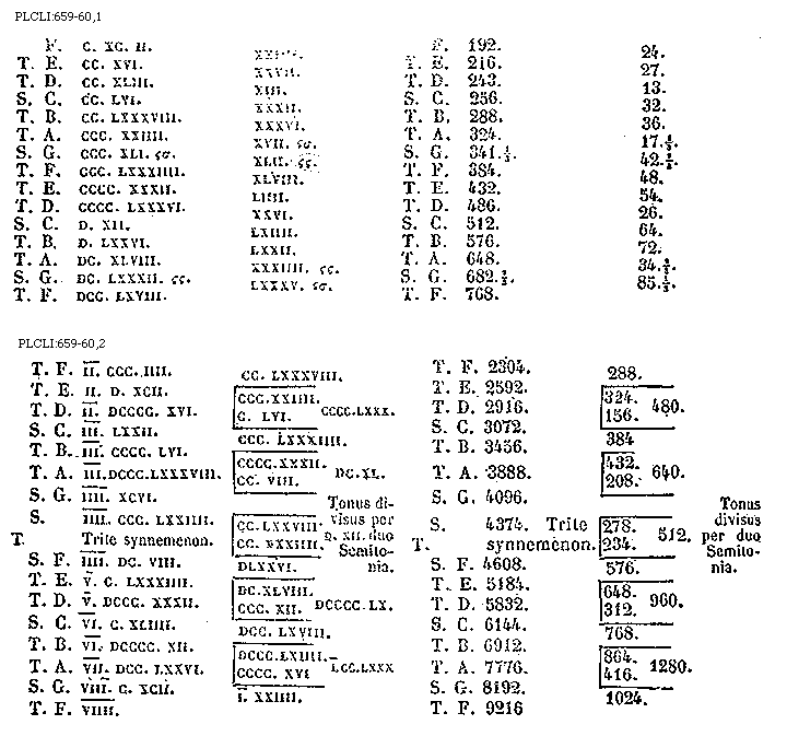 [PLCLI:659-60,2; text: Tonus, Semitonium, F. E. D. C. B. A. G. II[macron supra lin.]. CCC. IIII. II. D. XCII. II[macron supra lin.]. DCCCC. XVI. III[macron supra lin.]. LXXII. III[macron supra lin.]. CCCC. LVI. III[macron supra lin.]. DCCC. LXXXVIII. IIII[macron supra lin.]. XCVI. IIII[macron supra lin.]. CCC. LXXIIII. Trite synnemenon. IIII[macron supra lin.]. DC. VIII. V[macron supra lin.]. C. LXXXIIII. V[macron supra lin.]. DCCC. XXXII. VI[macron supra lin.]. C. XLIIII. VI[macron supra lin.]. DCCCC. XII. VII[macron supra lin.]. DCC. LXXVI. VIII[macron supra lin.]. C. XCII. VIIII[macron supra lin.]. CC. LXXXVIII. CCC. XXIIII. C. LVI. CCC. LXXXIIII. CCCC. XXXII. CC. VIII. CC. LXXVIII. CC. XXXIIII. DLXXVI. DC. XLVIII. CCC. XII. DCC. LXVIII. DCCC. LXIIII. CCCC. XVI, I[macron supra lin.]. XXIIII. CCCC. LXXX. DC. XL. Tonus divisus per duo Semitonia. D. XII. DCCCC. LX. I[macron supra lin.]. CC. LXXX, 2304. 2592. 2916. 3072. 3456. 3888. 4096. 4374. 4608. 5184. 5832. 6144. 6912. 7776. 8192. 9216, 288. 324. 156. 384, 432. 208. 278. 234. 576. 648. 312. 768. 864. 416. 1024. 480. 640. 512. 960. 1280.]