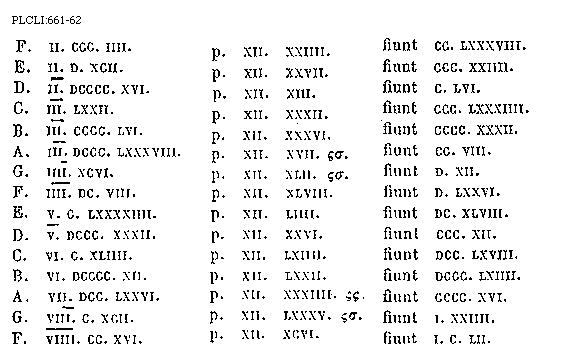 [PLCLI:661-62; text: F. E. D. C. B. A. G. II. CCC. IIII. II. D. XCII. II[macron supra lin.]. DCCCC. XVI. III[macron supra lin.]. LXXII. III[macron supra lin.]. CCCC. LVI. III[macron supra lin.]. DCCC. LXXXVIII. IIII[macron supra lin.]. XCVI. IIII[macron supra lin.]. DC. VIII. V. C. LXXXXIIII. V[macron supra lin.]. DCCC. XXXII. VI. C. XLIIII. VI. DCCCC. XII. VII. DCC. LXXVI. VIII[macron supra lin.]. C. XCII. VIIII[macron supra lin.]. CC. XVI. p. XII. XXIIII. XII. XXVII. XII. XIII. XII. XXXII. XII. XXXVI. XII. XVII. [stigma][sigma]. XII. XLII. [stigma][sigma]. XII. XLVIII. XII. LIIII. XII. XXVI. XII. LXIIII. XII. LXXII. XII. XXXIIII. [stigma][stigma]. XII. LXXXV. [stigma][sigma]. XII. XCVI. fiunt CC. LXXXVIII. CCC. XXIIII. C. LVI. CCC. LXXXIIII. CCCC. XXXII. CC. VIII. D. XII. D. LXXVI. DC. XLVIII. CCC. XII. DCC. LXVIII. DCCC. LXIIII. CCCC. XVI. I. XXIIII. I. C. LII.]